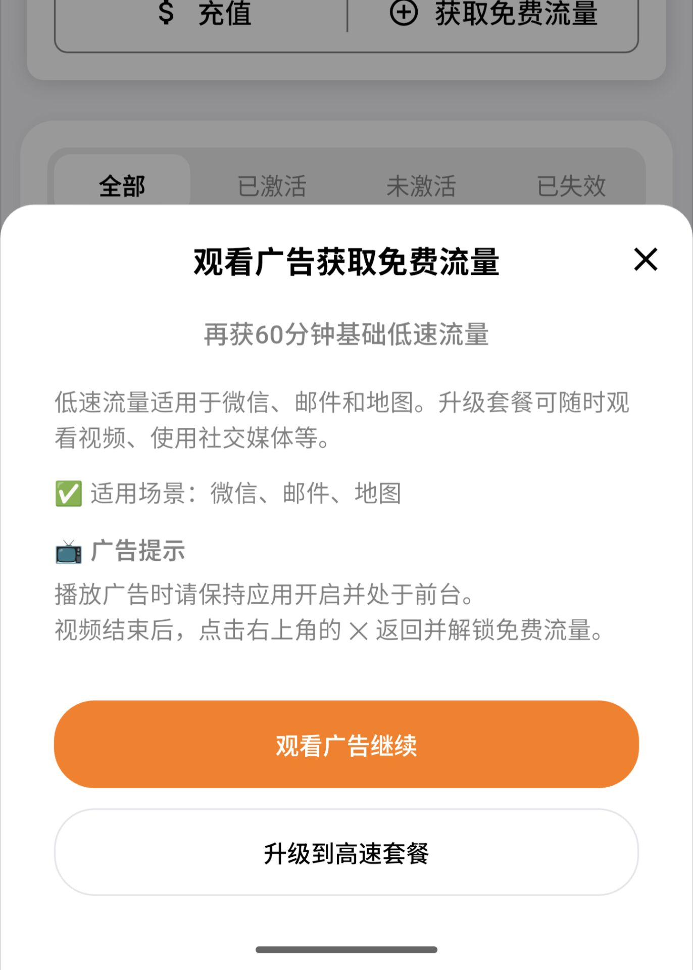 - 视频结束后,点击右上角的X返回并解锁免费流量
